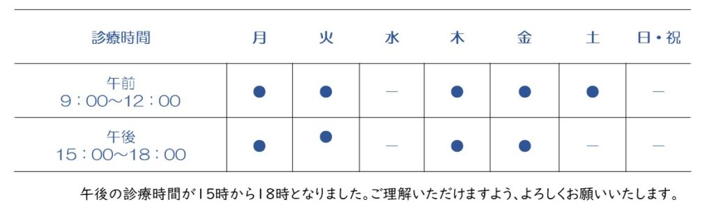 午後の診療時間を15時から18時までに変更させて頂きました。お電話頂く際にも、9時から12時、もしくは15時から18時にお願いいたします。